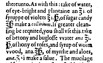 ... take of water, of eye-bright and plantaine an &ounce; i. of &s;yruppe of violets &ounce; i. <ABBR>&s;</ABBR>, of &s;ugar candy &ounce; <ABBR>&s;</ABBR> make a <HI>collirium.</HI> If greater clean|&s;ing be required, you &s;hall v&s;e this. take of betony and buglo&s;&s;e vvater <HI>ana</HI> &ounce; i. <ABBR>&s;</ABBR>, of hony of ro&s;es, and &s;yrup of worm vvood, ana. &ounce; <ABBR>&s;</ABBR>, of myrrhe and aloes, <HI>ana.</HI> &dram;. i make a &s;alue.