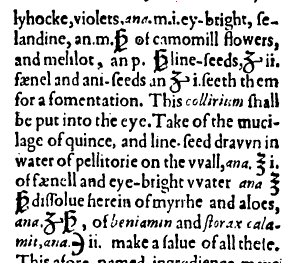 [Take ... holly]hocke, violets, <HI>ana.</HI> m. i. ey-bright, &s;e|landine, an. m. <ABBR>&s;</ABBR> of camomill flowers, and melilot, an p. <ABBR>&s;</ABBR> line-&s;eeds, &dram; ii. faenel and ani-&s;eeds an &dram; i. &s;eeth them for a fomentation. This <HI>collirium</HI> &s;hall be put into the eye. Take of the muci|lage of quince, and line-&s;eed dravvn in water of pellitorie on the vvall, <HI>ana.</HI> &ounce; i. of faenell and eye-bright vvater <HI>ana</HI> &ounce; <ABBR>&s;</ABBR> di&s;&s;olue herein of myrrhe and aloes, <HI>ana.</HI> &dram; <ABBR>&s;</ABBR>, of <HI>Beniamin</HI> and <HI>&s;torax cala|mit, ana.</HI> &scruple; ii. make a &s;alue of all the&s;e.