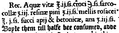 Suggested capture: <P>Rec. Aquae vitae &ounce;. ij. ss. croci &scruple;. ss. sarco|collae &dram;iij. resinae pini &dram;ij.ss. mellis rosacei &ounce;.j.ss.succi apij & betonicae, ana &dram;.iij.ss. <HI>Boyle them till halfe bee consumed, adde ... </HI></P>
