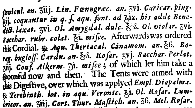 NOTE: There are several common abbreviations here: the tall symbol for "ounce" (looks like a flat-topped "3" with an extra bowl); "ss" (tall s followed by short s), an abbreviation for "semis" (="half"); the symbol for the unit of measure "scruple" (looks like a backwards-facing Greek "e"); and the symbol for the unit of measure "dram" (which seems to be a special use of the medieval English letter "yogh", though it is easily confused with "3" or "z"). These should be captured, respectively, as &ounce; (character entity); ss (the ordinary letters); &scruple; (character entity); and either &dram; (preferred) or &yogh; (acceptable) (character entities).