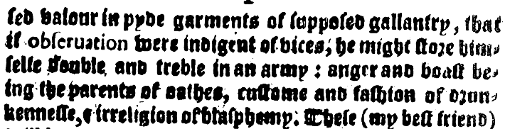 |sed valour in pyde garments of supposed gallantry, that i$ obseruation were indigent of vices, he might store him|sel$e $ouble and treble in an army: anger and boast be|ing the parents of oa$he$, custome and $ashion of $r$n|kennesse, $ irreligion of blasph$my. These (my best friend)