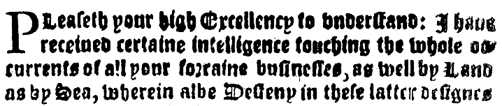 PLeaseth your $igh Excellency to $nderstand: I haue receiued certaine intelligence touching the whole o$|currents of all your $orraine businesse$, as well by Land as by Sea, wherein albe Desteny in these latte$ d$sign$s