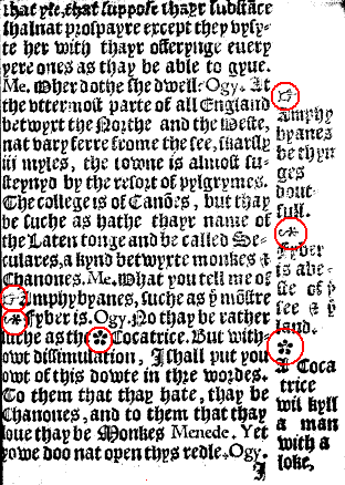 We do have a character entity for this first marker, so use it: <NOTE PLACE="marg" N="&rindx;">Amphy+byanes be thyn+ges dout+full.</NOTE> If we did not have a character entity for the second marker, we would substitute "*", but we can now use &flower; <NOTE PLACE="marg" N="&flower;">Fyber is a be|ste of y^e see & y^e land.</NOTE> Again, if we did not have a character entity for the third marker, we could substitute "*", but this looks like another form of stylized flower, so we will again use &flower;: <NOTE PLACE="marg" N="&flower;">A Coca+trice wil kyll a man with a loke.</NOTE> |