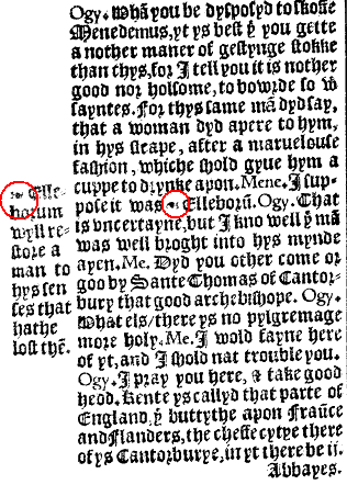 And finally, if we did not have a character entity for this, we could substitute "*", but this looks like a stylized leaf, so we can use &leaf; as the value of the N attribute: <NOTE PLACE="marg" N="&leaf;">Elle|borum wyll re|store a man to hys sen+ses that hathe lost the~.</NOTE> |