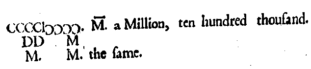 <ITEM>&rn1000000;. <ABBR>M.</ABBR> a Million, ten hundred thousand.</ITEM>