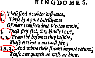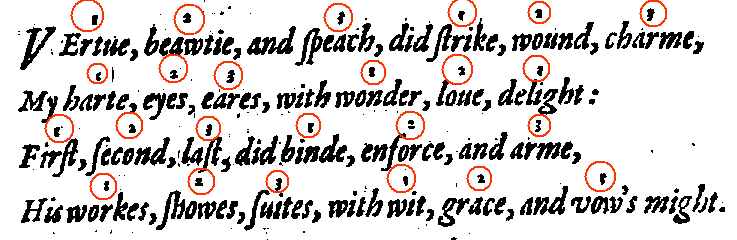 [This seems to be a kind of poetic puzzle; one makes sense of it by connecting the words with the same numbers in the same line. Thus the two lines above mean roughly "Vertue did strike my heart with wonder; beauty did strike my eyes with love; speech did charme my ears with delight." So the numbers are significant and should be captured; since we have no special way of recording this kind of scheme, we'll just record the fact of their existence, using superscripts.]
