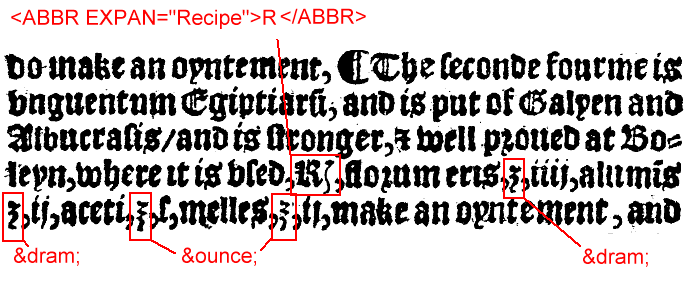 Example: "z"-like characters appear in several circumstances: "z" follows "q" to form one variant of &abque;; "z" follows "s" to form the symbol we call &sed; but which may simply mean <ABBR>s</ABBR>; as the last letter in a word, "z" may be a form of "-m"; "z" can form part of at least two common abbreviations, "viz." (videlicet) and "scz." (scilicet). Our policy to date on these has been as follows: