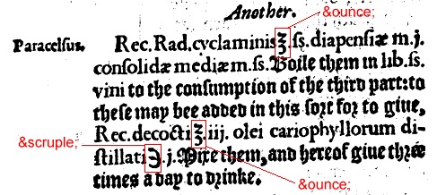 NOTE: There are several common abbreviations here: the tall symbol for "ounce" (looks like a flat-topped "3" with an extra bowl); "ss" (tall s followed by short s), an abbreviation for "semis" (="half"); the symbol for the unit of measure "scruple" (looks like a backwards-facing Greek "e"); and the symbol for the unit of measure "dram" (which seems to be a special use of the medieval English letter "yogh", though it is easily confused with "3" or "z"). These should be captured, respectively, as &ounce; (character entity); ss (the ordinary letters); &scruple; (character entity); and either &dram; (preferred) or &yogh; (acceptable) (character entities).