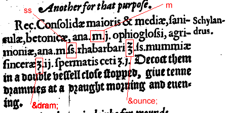 NOTE: There are several common abbreviations here: (an odd form of) ounce, dram, scruple, recipe, semis.