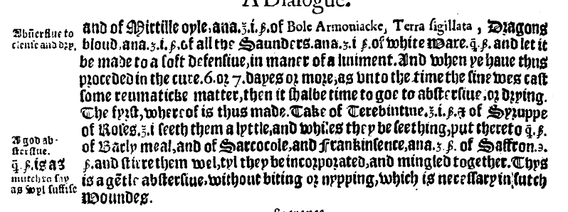 NOTE: There are several common abbreviations here: ounce, dram, an odd form of semis, scruple, quarter, ana (and a strange use of -z in 'az' (= 'as') in the note on the left.